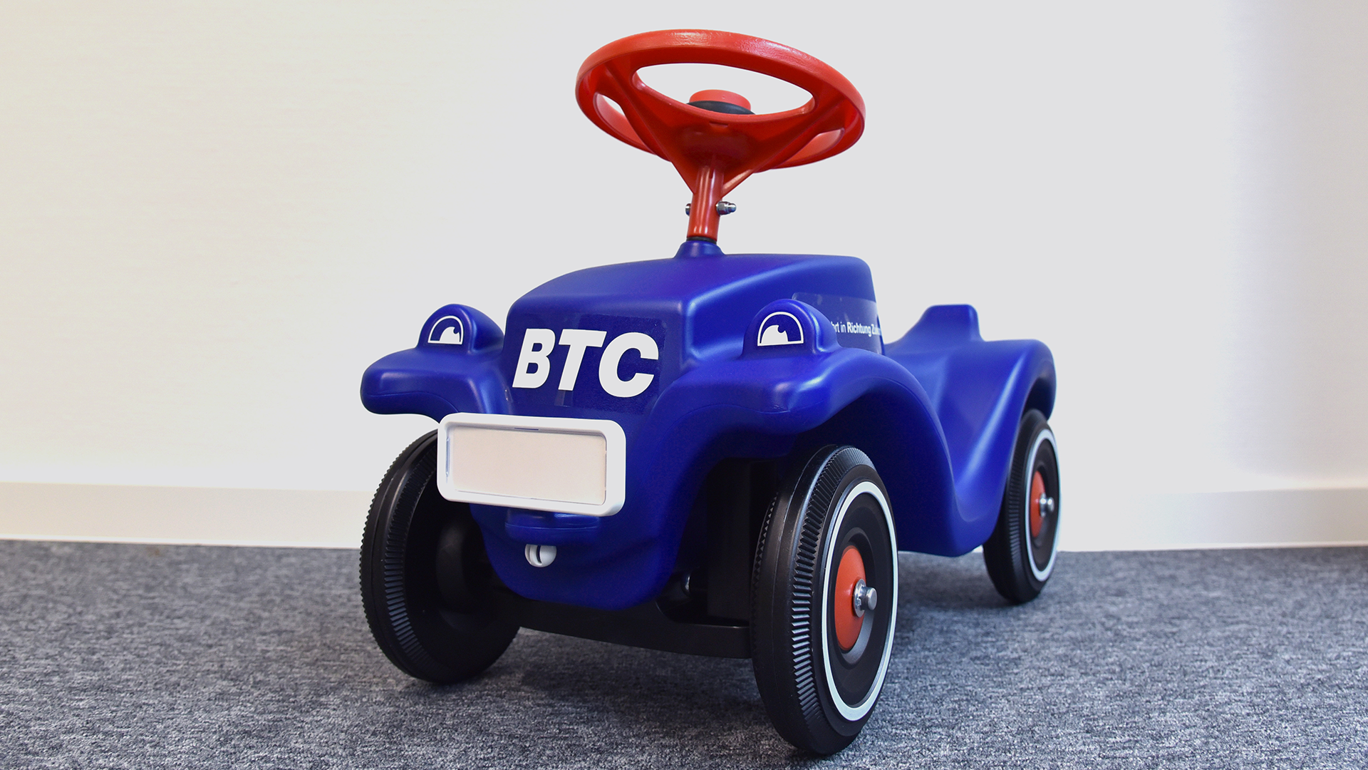 Wir freuen uns zusammen mit unseren BTC-Mitarbeiter:innen über ihren Nachwuchs und sponsern den ersten „Dienstwagen“ – ein BTC-Bobbycar mit Namenskennzeichen.