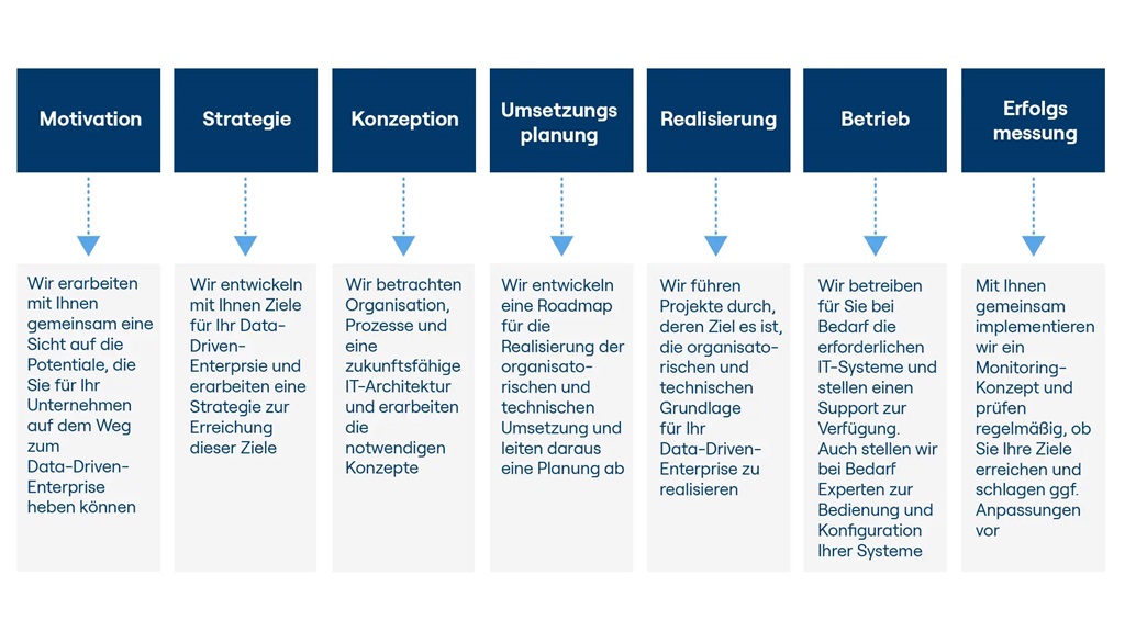 Je nachdem, wo sie gerade Ihre Herausforderung sehen, können wir Sie an unterschiedlichen Stellen auf Ihrem Weg zum datengetriebenen Unternehmen unterstützen. Wir beraten Sie gerne end-to-end oder zu gewünschten Einzelthemen.