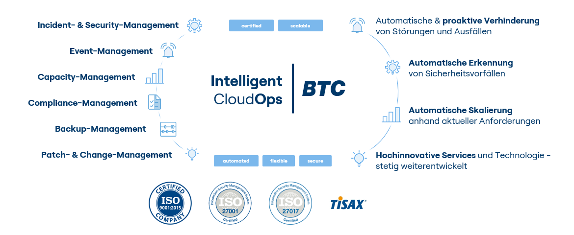 Unser Intelligent CloudOps-Betriebsmodell vereint Entwicklung, Weiterentwicklung, Betrieb und Sicherheit in einem Team. Unterstützt durch AWS Technologien verbessern wir erheblich die Automation Ihres Cloud-Betriebs, sorgen für eine stabile und schnelle IT und optimieren kontinuierlich Ihre Cloud-Services. Dabei setzen die AWS-Expert:innen der BTC auf Infrastructure as Code, automatisierte CI/CD-Pipelines und die Verwendung cloud-nativer Services von AWS.