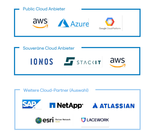 Unsere engen Kooperationen mit führenden Cloud-Anbietern und Technologiepartnern ermöglichen es uns, maßgeschneiderte, sichere und compliance-konforme Lösungen zu entwickeln - präzise abgestimmt auf Ihre Anforderungen an digitale Souveränität, Datenschutz und Datenhoheit.