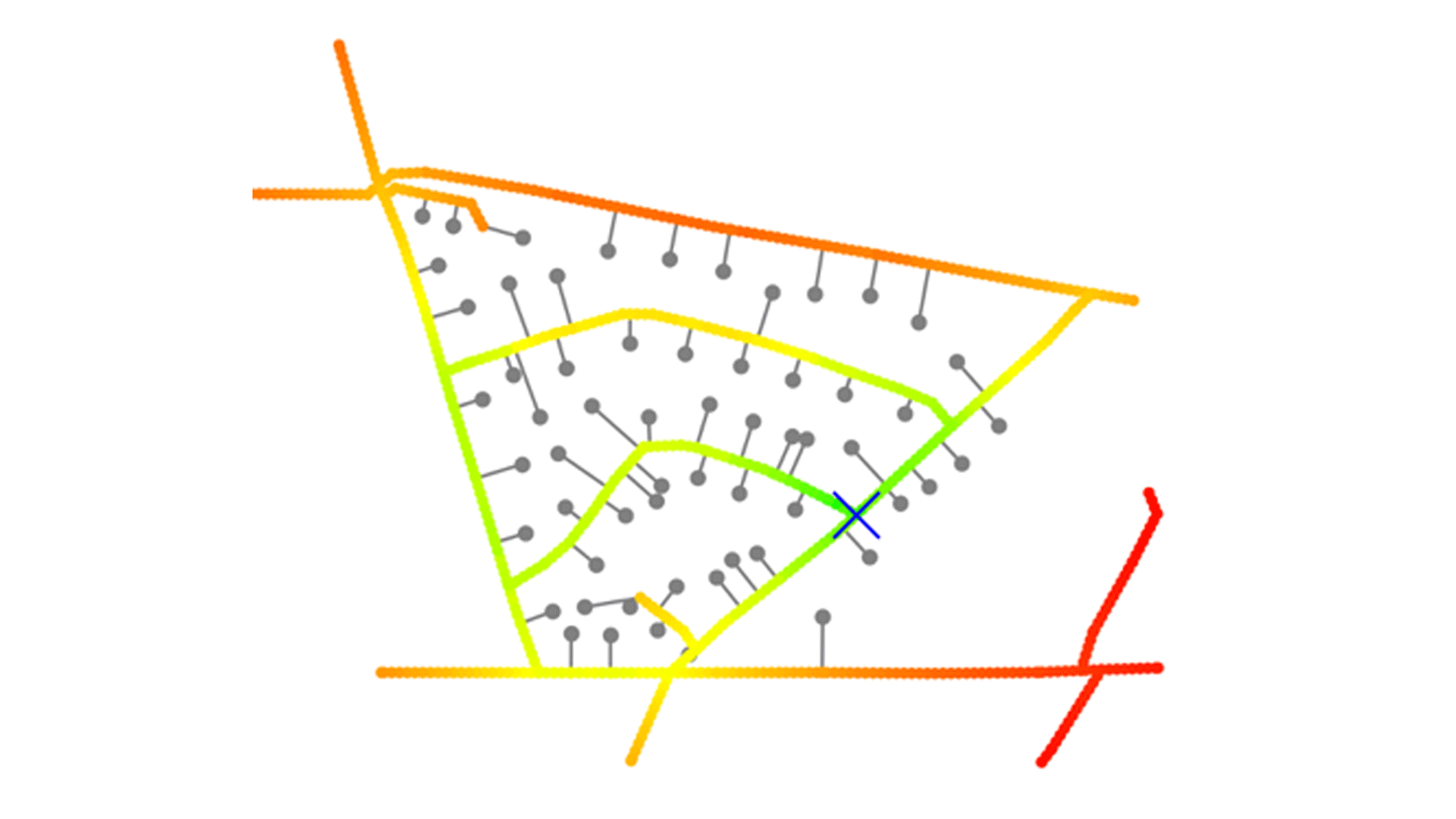 • Die Abbildung zeigt den Vorschlag zur Platzierung eines KVZ (blaues Kreuz) unter der Bedingung, dass zu jedem Hausanschluss eine direkte Verbindung bestehen muss. Die Einfärbung der Karte gibt die Kosten bei Platzierung an unterschiedlichen Standorten wieder.
