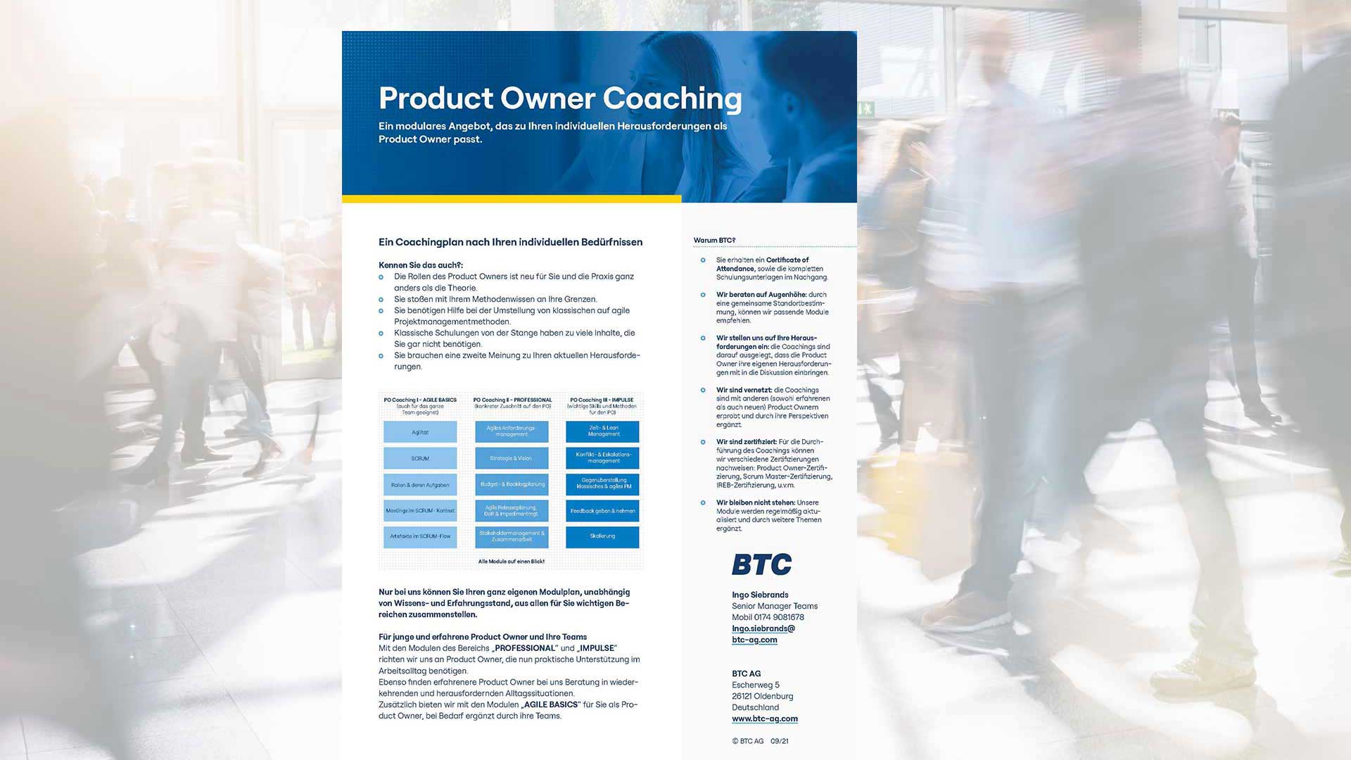 Mit einem individuellen Coaching unterstützen wir Product Owner an genau den Punkten der SCRUM-Methoden, die in der Praxis Schwierigkeiten machen. Eine Zertifizierung Ihrer Teilnahme ist inklusive.